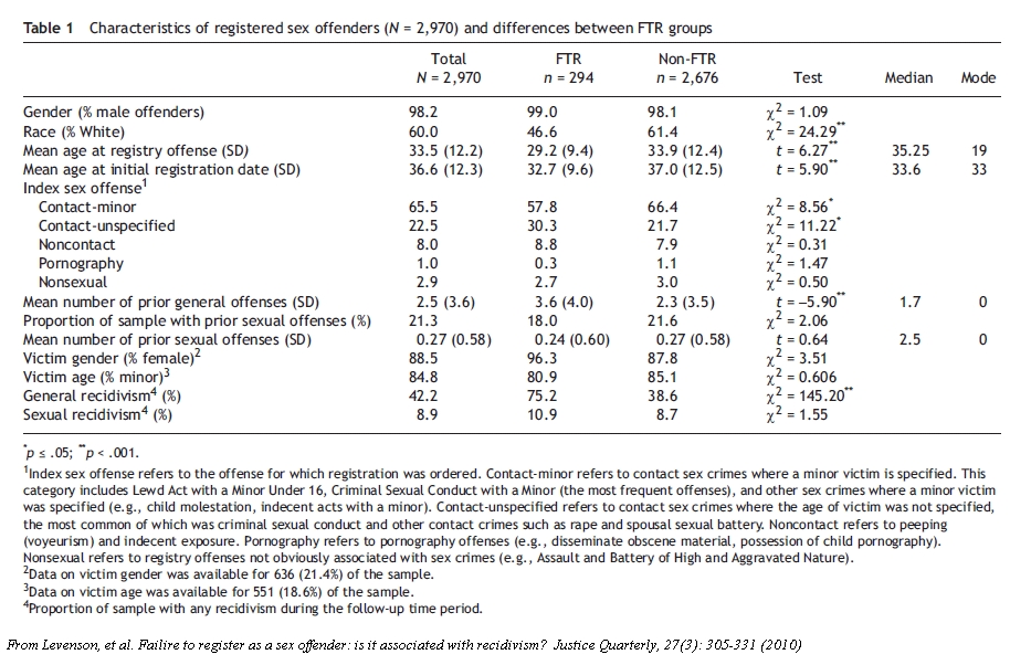 FTR [failure to register] offenders had a significantly higher mean number of prior general arrests than offenders without FTR and were significantly more likely to have a general recidivism event (75% vs. 39%, respectively).